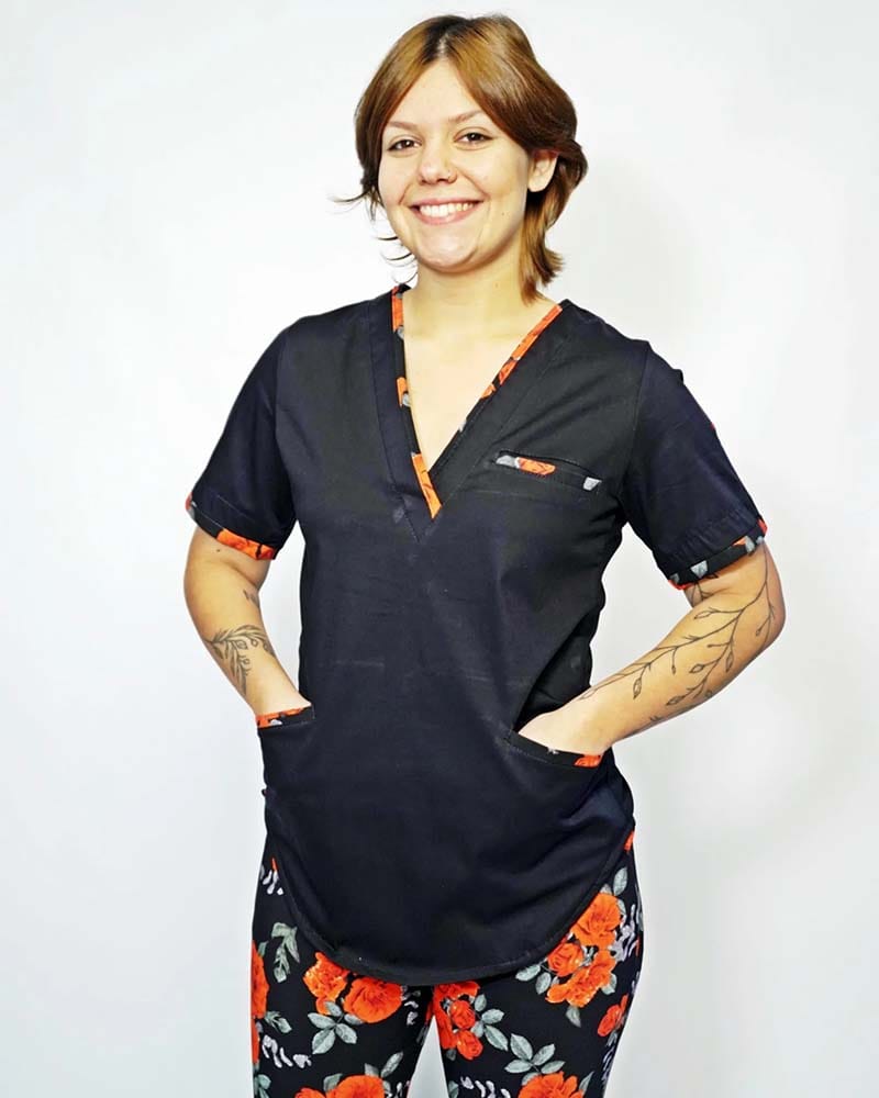 Cuello V cerrado para que puedas trabajar tranquila y hacer movimientos libremente