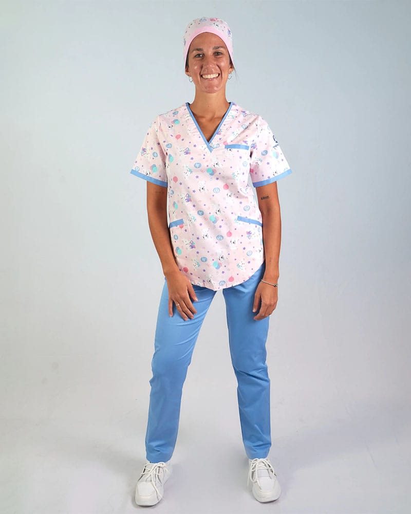 Ambo cuello V confeccionado en tela Spandex (tela flexible calidad premium para mayor comodidad) con estampado exclusivo de nuestra empresa Estampado con con conejitas felices fondo rosa bebe