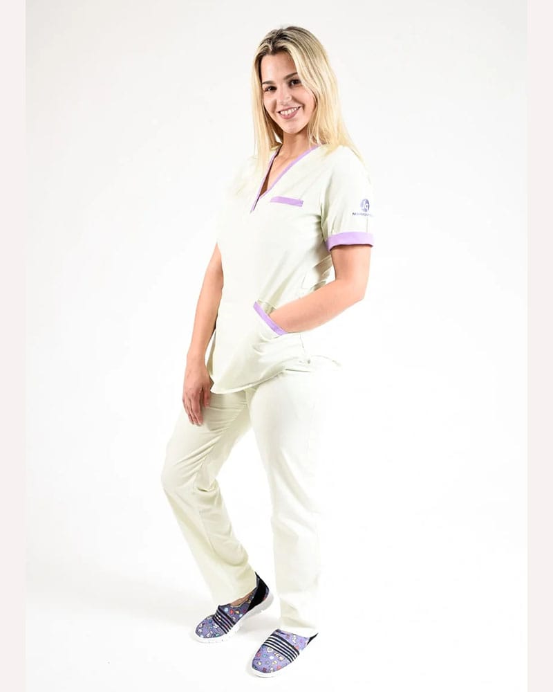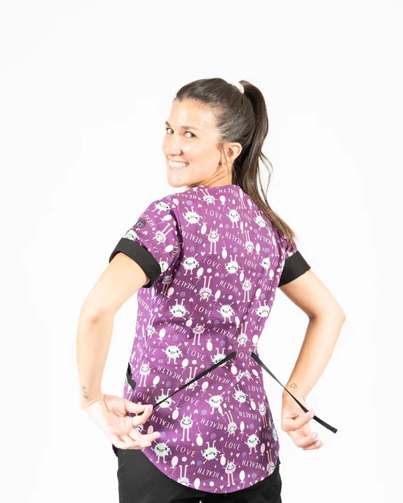Ambo cuello V confeccionado en tela Spandex (tela flexible calidad premium para mayor comodidad) con estampado exclusivo de nuestra empresa Estampado con Mounstros felices fondo color bordoleta exclusivo también de la empresa